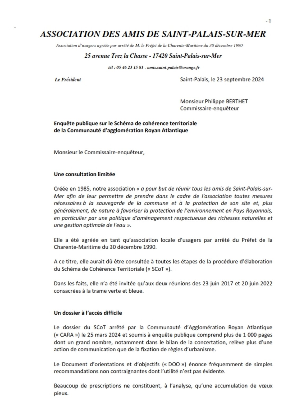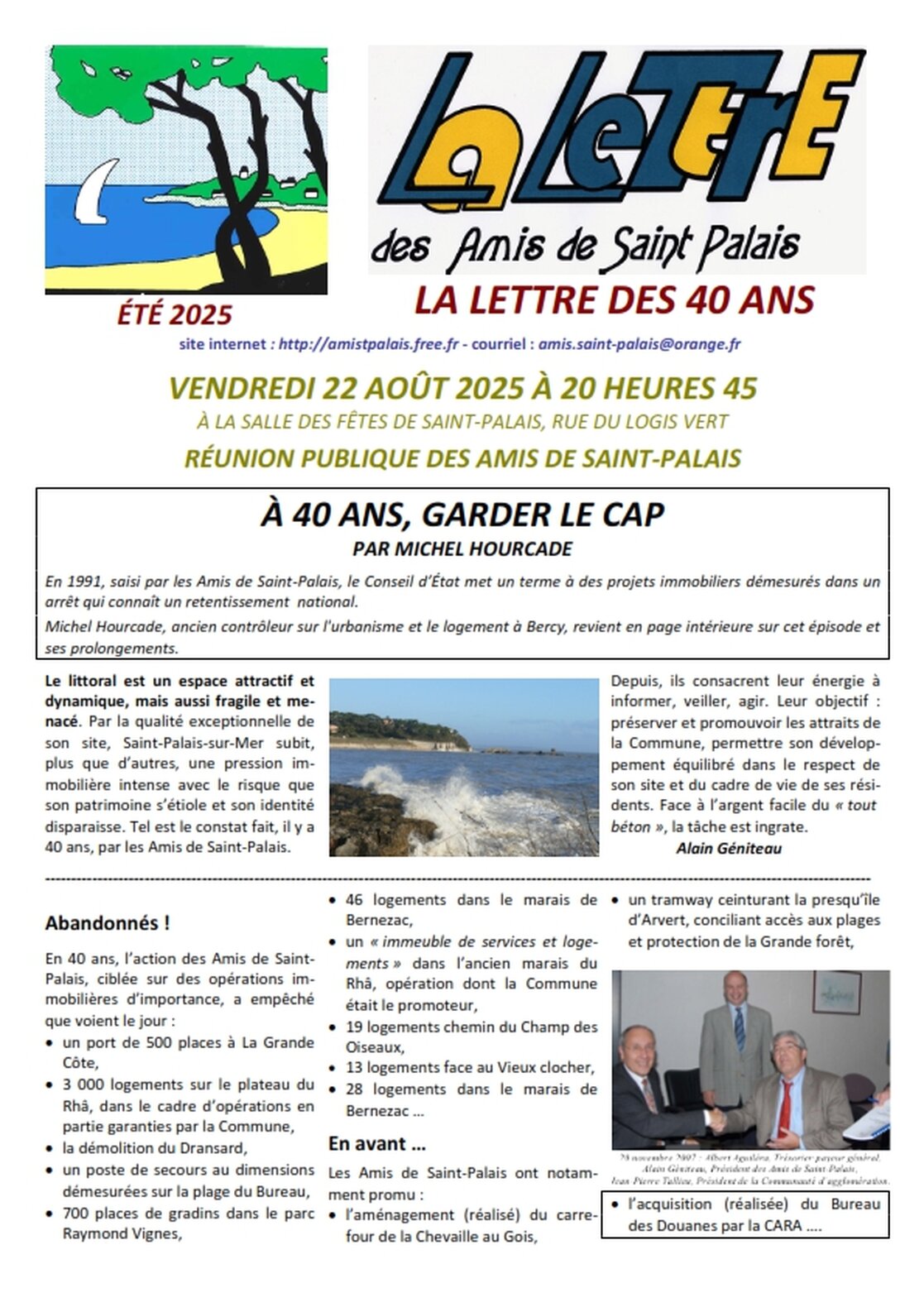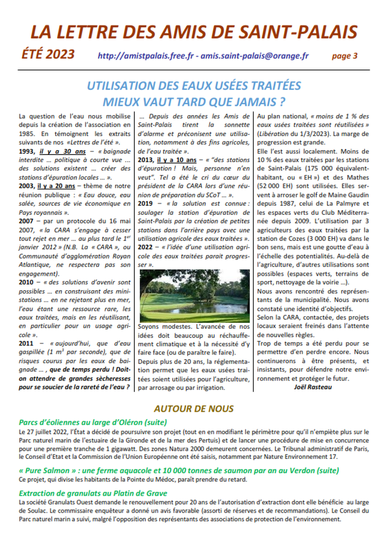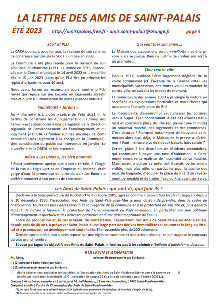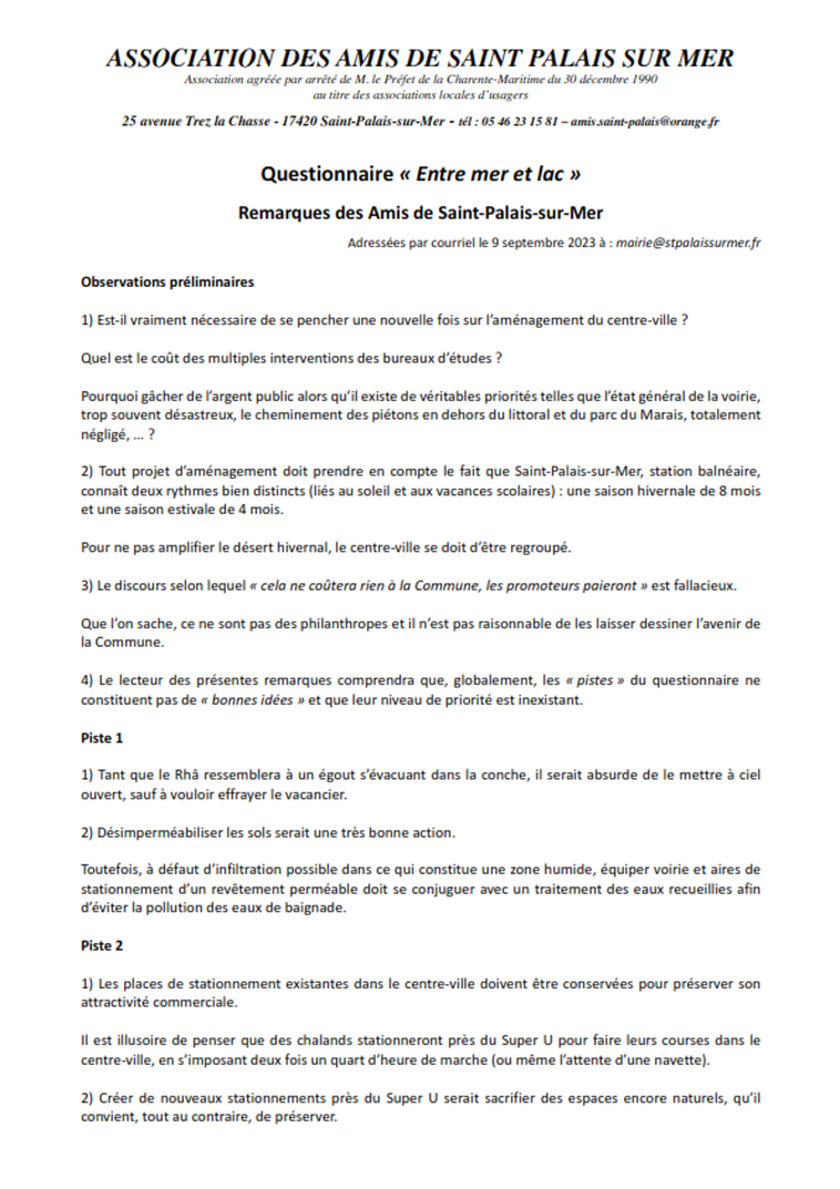 Association agréée par arrêté de M. le Préfet de la Charente-Maritime du 30 décembre 1990 au titre des associations locales d’usagers 25 avenue Trez la Chasse - 17420 Saint-Palais-sur-Mer tél : 05 46 23 15 81 – amis.saint-palais@orange.fr