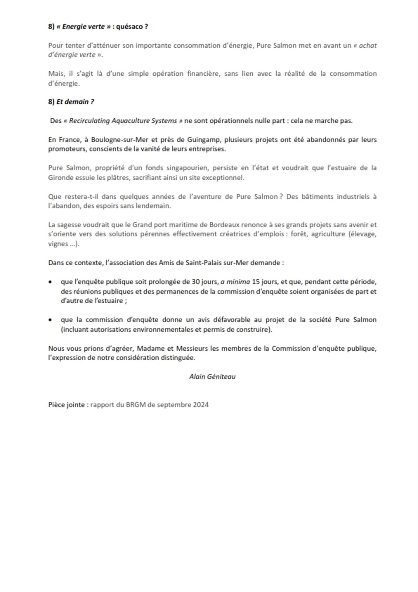 Madame, Monsieur,Vous trouverez ci-joint la contribution des Amis de Saint-Palais-sur-Mer à l'enquête publique sur le projet de la société Pure Salmon (cf pièce jointe).Vous pouvez contribuer également à cette enquête publique en vous rendant sur le site :https://www.registre-numerique.fr/construction-elevage-saumon-verdonsurmerVous verrez que vous n'y serez pas seul (e).Vous pouvez vous inspirer de la contribution des Amis de Saint-Palais (sans toutefois la recopier).ATTENTION : l'enquête publique prend fin en l'état lundi 19 janvier à 16 heures.CordialementAlain GéniteauPrésident de l'association des Amis de Saint-Palais-sur-Mer